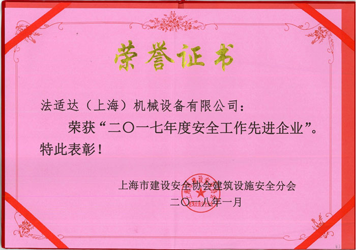 榮獲市“2017年度安全工作先進企業(yè)” 時 間:2018-01-18 22:10:43 瀏覽次數(shù):7278 法適達榮獲由上海市建設安全協(xié)會建筑設施安全分會頒發(fā)的“2017年度安全工作先進企業(yè)”。